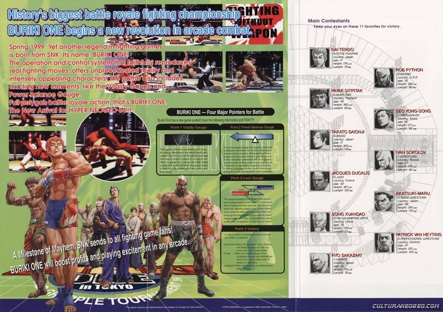 Buriki One (武力 One, Buriki One: World Grapple Tournament '99 en Japón), es un juego de lucha en 3D creado en 1999 (el último del catálogo de la Hyper Neo Geo 64), el cual tiene un sistema de combate único en su género. La plantilla de luchadores es de lo más variada, los luchadores que la forman dominan técnicas de combate muy diferentes unos de otros. Compuesta por nada menos que 11 luchadores, curiosamente podemos encontrarnos a Ryo Sakazaki, de la saga Art of Fighting, pero también a algún otro personaje que aparecería años más tarde en otros juegos de SNK-Playmore, como Gai Tendo, en el conocido King of Fighters XI.