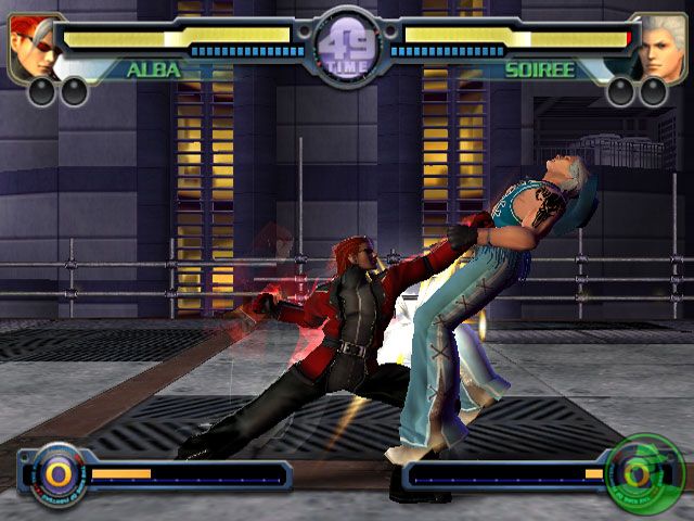 Alba trata de encontrar la fuente del incendio, pero se encuentra con Kyo Kusanagi (que es el principal rival del KOF: MI). Al ver las llamas de Kyo, las relaciona con el fuego de la ciudad, y cree que Kyo es el responsable. Kyo se molesta mucho al ver lo enfurecido que está Alba, y ambos comienzan una lucha a muerte que dura interminables horas. Cuando Alba ya estaba a punto de ganar a Kyo, Iori Yagami llega, interrumpiendo la pelea y sabiendo que el culpable de todo es Ash, por su propósito de acorralar a Kyo y robarle sus poderes. Alba se marcha disculpándose con Kyo, aunque el propio Kyo se siente culpable por ser él el verdadero objetivo del villano, viéndose en cierto modo culpable de lo sucedido en la ciudad.