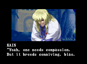 Kain es una persona calmada, precavida y con una gran fuerza de voluntad. Es muy serio en sus acciones y también muy ambicioso, pero sin caer en la megalomanía. Su maldad en realidad nace de un sentimiento bueno, de intentar que la gente aprecie su vida por encima de todo, y que se aproveche el momento sin pensar en lastimar al prójimo. Odia las emociones, ya que segun él, son una fuente de parcialidad y subjetividad.