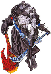 Sus armas tienen inscripciones con los ojos estilizados y con diseños similares a los que aparecen grabados en las armas de Asura y Oboro.
